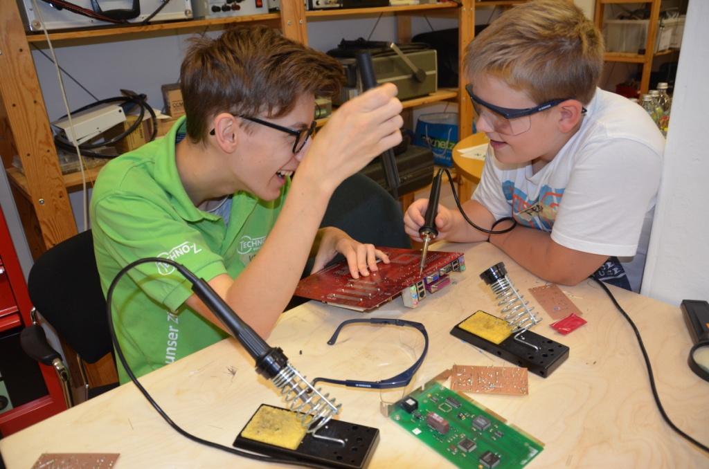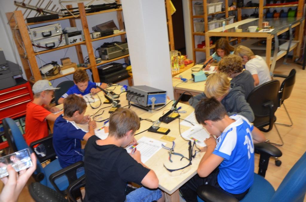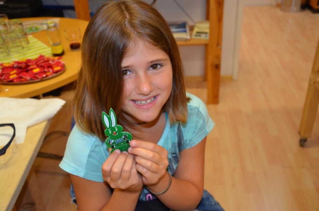 Zu Beginn durften sie wie versprochen einen eigenen Blinkhasen machen, indem sie nach Anleitung der Betreuer verschiedene Bauteile auf eine Platine löteten. Dabei zeigten sie sehr viel Geschick und waren alle sehr bemüht. Nachdem alle Hasen fertig gestellt worden waren, durften sich die Kids mit Obst und Traubenzucker stärken.