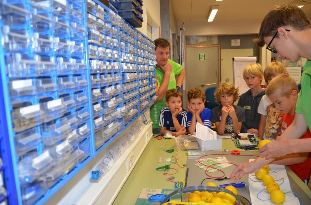 Den ganzen Vormittag über drehte sich alles um das Thema Strom, weshalb erst einfache Fragen wie „Was ist Strom“, „woher kommt Strom“ usw. anhand von Plakaten kindergerecht erklärt wurde. Um anschaulich zu machen wie vielfältig das Thema ist, wurden den Kindern einige Experimente wie die „Zitronenbatterie“, wobei mithilfe von mehreren Zitronen eine LED zum Leuchten gebracht wurde, gezeigt. Außerdem wurde die Leitfähigkeit von Wasser überprüft und durch Zugabe von Salz optimiert. Mit einer selbstgebastelten Spule wurde aus einem Nagel ein Dauermagnet erzeugt und brachte die Kids zum Staunen. Uns war es dabei ein besonderes Anliegen, den Kindern klarzumachen, dass Strom zwar nützlich aber auch hochgefährlich ist und dass sie elektronische Geräte daher immer mit Vorsicht verwenden sollten.